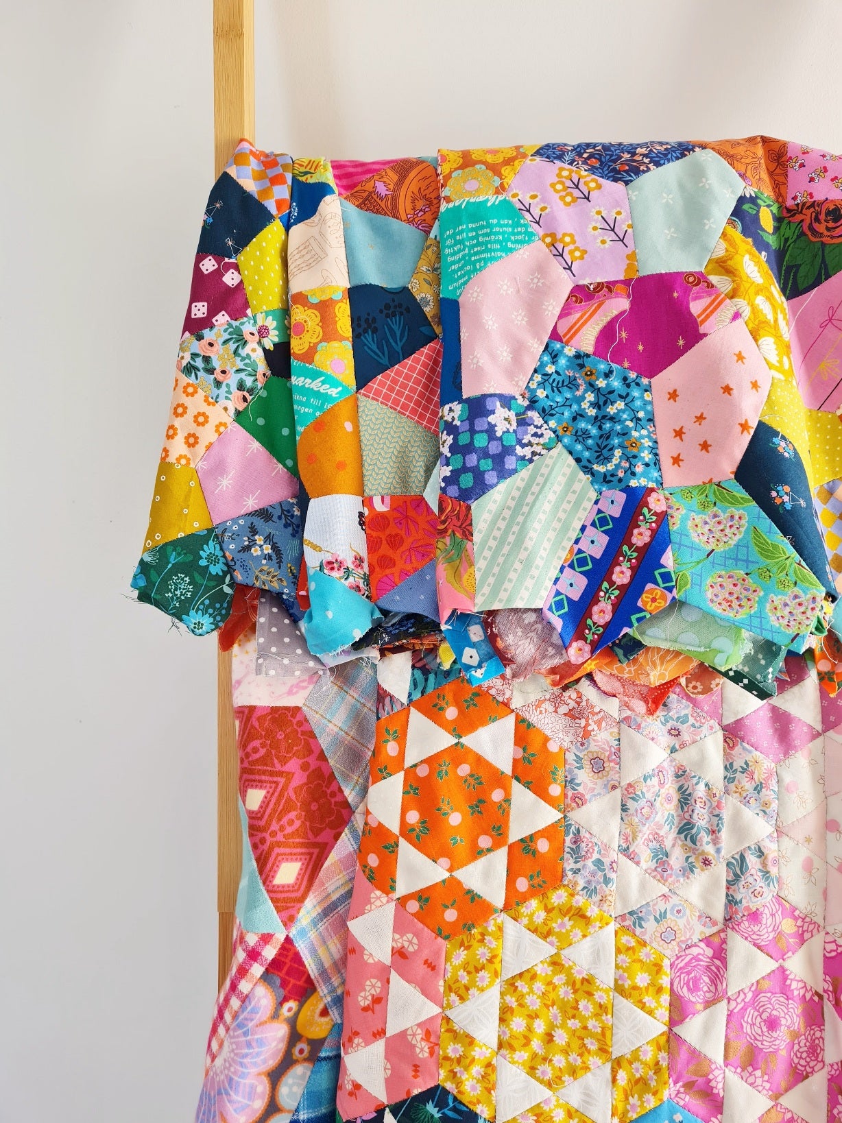 Do you abandon quilts because they just don't hold your attention? My Hexie Harvest Quilt is made up of 15 different hexagon blocks. Make 7, and then move on to the next one!